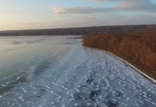 Aerial footage of a frozen Lake Delta in upstate New York at sunset. Filmed at Positively Rome’s Moonlight Trail Night.